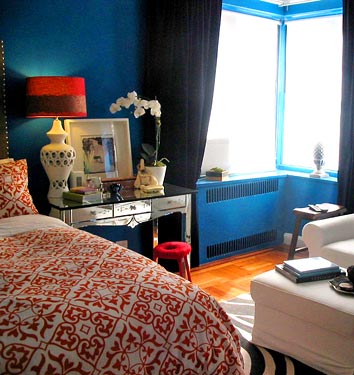 This sumptuous peacock wall color with white and black accents (and of course the vivid orange and white duvet cover) is so moody and glamorous!